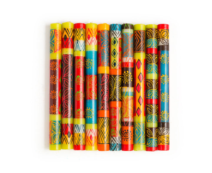 10 tapers in the 10 designs of the Desert Rose collection. Beautiful colors of the African desert; golden yellow, turquoise blue, browns, orange painted in blocks of color with abstract patterns on top.