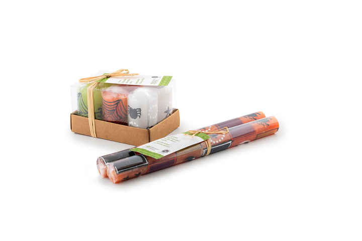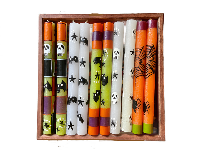 Halloween hand made and hand 9" matched taper pair and  2" votive 6-pack box. Photo illustrates the packaging.  Painted in traditional Halloween designs; skulls, spiders, bats, and Halloween colors.  Fair Trade. Both come with an artisan story card.