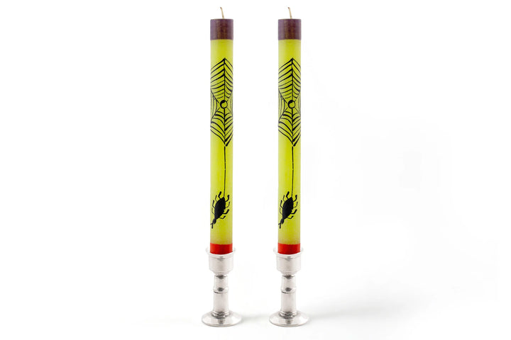 Halloween hand made and hand painted 9" dinner tapers. Painted in traditional Halloween designs; skulls, spiders, bats, on orange, green, and white tapers with touches of black. Taper candles are shipped in a match pair. Fair Trade.