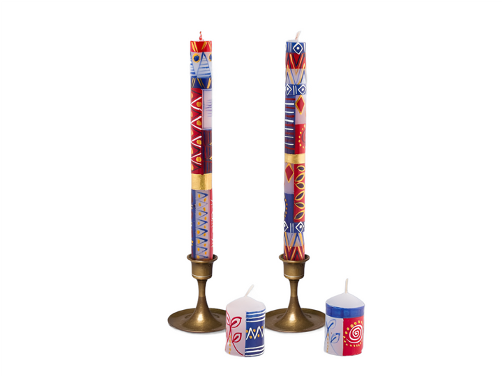 Red, White & Blue hand crafted taper candles with brass candle holders, and two votive candles. Red, white, blue, and gold pigment paintings.